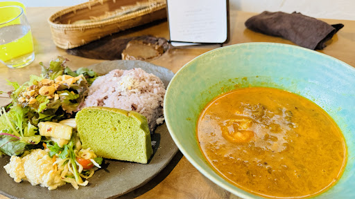 Read more2025年5月に池田町に移転。とにかく「カンボジア料理」というものを初めて食べました! カンボジアカレーは手羽元をココナッツミルクとハーブで煮込んだ甘いカレー。 お皿にはご飯、生野菜 (新玉ねぎのソース) ハイビスカスのサラダ 、高野豆腐、にんじんと大根のピスルス 生米パン 私はセットドリンクとは別に「カンボジアコーヒー」を頼んだ。