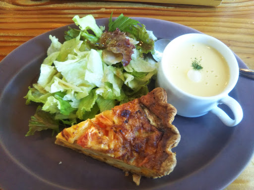 キッシュプレートを頼みましたが、全然美味しくなかったです。パイ生地はシナシナしていて塩味も感じられず、アパレイユはパサパサしてました。付け合わせのスープは味が想像以上に薄くて、市販のスタージャのポタージュの方が美味しいです!むしろ、市販のスープを水で薄めたような味でした。 店内の作りは可愛らしい感じでしたが、バースデーケーキを販売しているらしく、色あせた写真がたくさん飾られていて、お店の雰囲気が台無しです。木の匂いなのか、少し臭いのもずっと気になっていました。 また、お店のドアは終始開けっ放しで、虫が入ってきていて、食事中に虫が来るので食べにくかったです。 スタッフの方は男性の方と女性の方で切り盛りしているみたいですが、女性の方の接客はあっさりしていて、お客様への敬意を全く感じられず、帰り際の挨拶も気持ちが全くこもっていない挨拶でした。 お料理も店内の雰囲気も事前にInstagramなどで他の方のものを見て気になって行ったものの、期待を大きく外されたので、も...