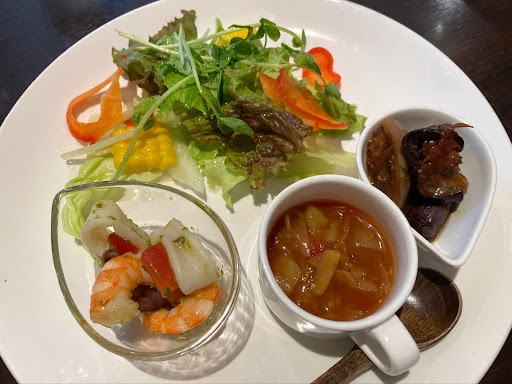 Read more平日12:00頃伺いました。店内半分くらい埋まっており、女性のおひとり様もいらっしゃいました。デザート付きのBランチをオーダー。 提供時間は早いです。ホールの方はお水やお料理を持ってきた時、空いたお皿を下げる度に頭を下げ「失礼します」と言葉を添えられて、とても丁寧な感じでした。前菜、パスタは塩加減がよくとてもおいしく、マリネの魚介は固くなくプリプリとして火の通し方が絶妙でした。残念だったのは、パスタに入っていた茹で秋刀魚が生臭い切身があり新鮮ではない感じがしました。旬の時期なのでとても残念でした。デザートのブルーベリーパンナコッタは上品な甘さで珍しいフレーバーでおいしかったです。ぶどうのジュースはくどい甘さがなくスッキリした味わいで選んでよかったです。 次回はピザとリゾ...