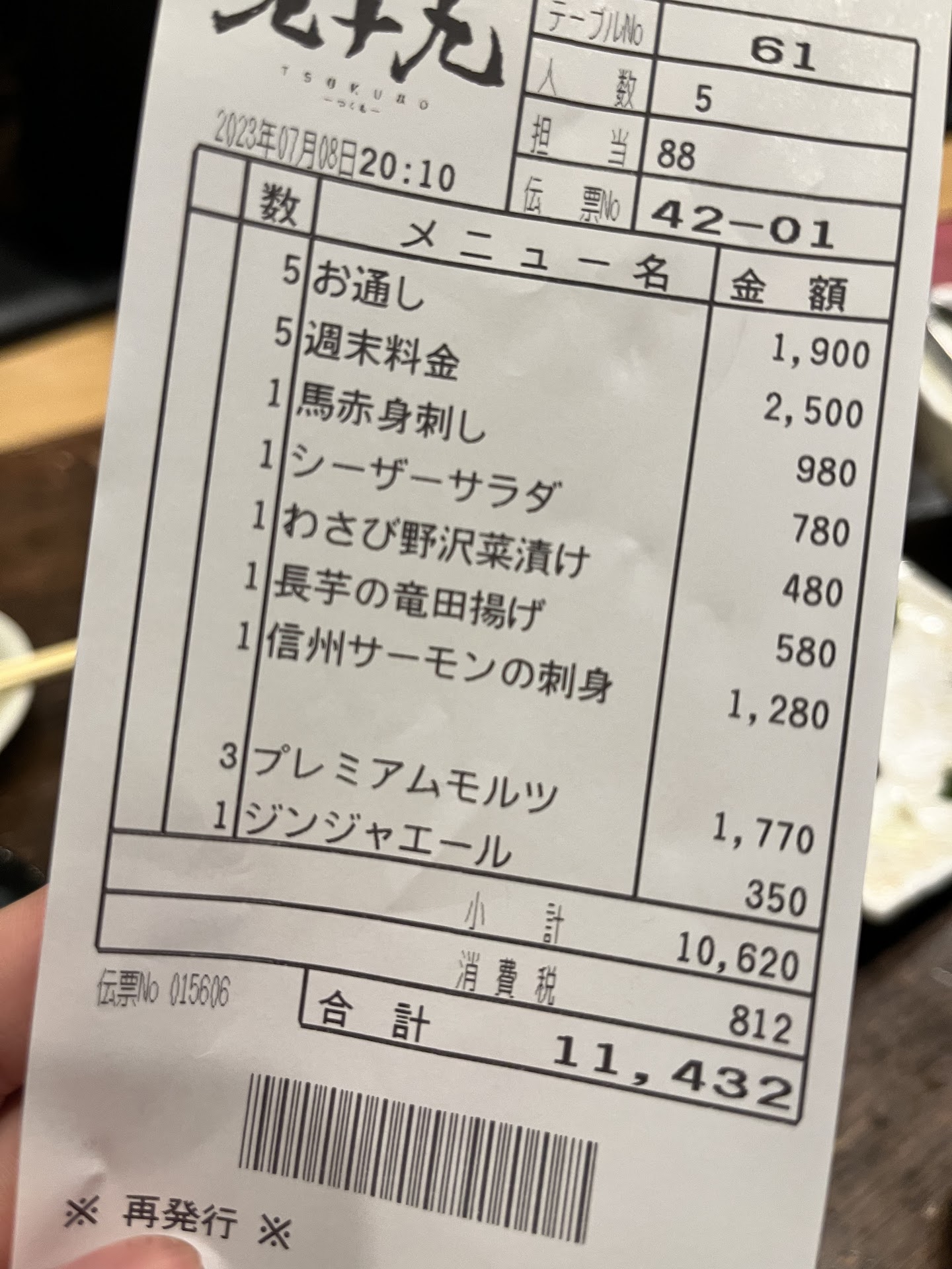 ようやくこの店の経営方針を理解し、まだ遅れている2人は来ていませんでしたが、離席も促されているのでお望み通み帰ろうとし、会計用の伝票を見たところ…まだ来ていない2人の分も含めたお通し代+謎の週末料金が記載されていました。謎の週末料金についてはもちろん先立っての説明はありません。会計の際に2人まだ来ていないことを伝えるとその分の料金は嫌な顔をされながら引いてもらえました。