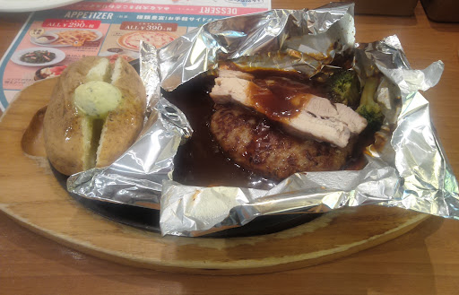 間髪おかずに息子と自分の 包み焼きバーグ が到着。 皮つきの丸ごとジャガイモ の存在感もイイ感じ。