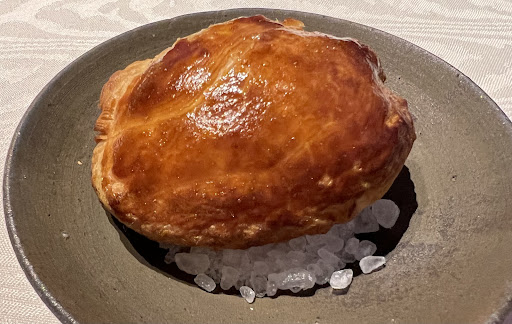 ✨鯉と帆立のパイ包み(クレソンとワサビ菜添え) サクサクのパイの中には、帆立の濃厚な甘みと鯉の繊細な旨味がぎっしり。白味噌を隠し味にしたコクのあるブールブランと鯉の出汁ソースが全体をまとめ、クレソンとワサビ菜の爽やかさが後味を引き締めます。