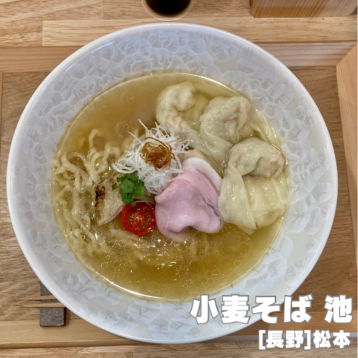 Read more小麦そば 池@ 長野県松本市中央1丁目25-1 どうも、さぴおです ______________ 🟦どこまでも角のない塩ダレに「うわ、うまっ!」と思わず零れた 饗くろ㐂出身店主さんによる鶏塩清湯!! 🍥ポイント ✅ 饗くろ㐂出身 ✅どこまでも丸い塩カドの取れた塩清湯スープ ✅手もみ麺はもち姫使用のもちトロ仕様!  ̄ ̄ ̄ ̄ ̄ ̄ ̄ ̄ ̄ ̄ ̄ ̄ ̄ ̄ [点数] 90点 ☆4.5 [アクセス] 『松本駅』(296m) [休日] 不定休 [注文メニュー] 雲呑塩そば(手もみ麺) [並び・システム] 並びなし・チケット青春 [食材] 動物出汁、魚介出汁、香味野菜出汁、チャーシュー、鶏モモチャーシュー、メンマ、ワンタン、ネギ、カイワレ、ドライトマト、中華麺 [味] 塩