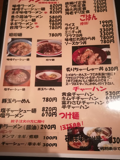 Read more二人で水餃子、ジャンボ肉汁餃子、味噌チャーシュー、石焼辛味噌つけ麺を注文して食べました。 水餃子は厚めのモチモチした皮がツルンとしていて餡も美味しかったです。 ジャンボの方はどこが肉汁?な感じで、餡の味は多分干し海老と思われる風味が強すぎてイマイチ好みではなかったです。 味噌チャーシューは味噌バタコーン的な風味で悪くないです。 チャーシューは大きくてトロトロで美味です。 つけ麺好きの自分は「信長」風の石焼き鍋スタイルに期待しましたが、、なかなか美味しかったです。 ただ、辛味噌なので出てきていきなりすするとむせます。 つけ汁は味噌ベースでいろいろな風味が混ざり合っていて、「信長」には及ばないものの、良い味出してます。 驚きは、つけ麺に締めのリゾット用にチーズが載った小盛りのご飯がついてきたこと。 美味しいつけ汁なのでこれも美味しく頂きましたが、ちょっとカロリーオーバーでした。 つけ麺は一玉か二玉が選べるんですが、一玉にしておいて良かった。 ちなむに麺はどちらも中太麺でした。 次回、普通の...