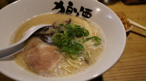 マイルドながら博多・長浜ラーメンのようなさらっとした細麺豚骨のラーメンをいただけます。 麺は博多ラーメンのような細麺より少しだけ太く感じます、定番ですが注文時に固さが選べます。 スープは、良く言えば品があってマイルドでクセがない、悪く言えば薄くて旨味などのパンチがない、と考えます。 16時間煮込まれるという豚骨スープはサラサラとしたタイプですが、博多ラーメンのような豚骨特有の匂いはほとんどなく、あっさりしています。 デフォルトで塩味は控えめなので、普段ジャンクなラーメンではないものを好む方にはハマる一杯かもしれません。 個人的には豚骨感が少なめで、丸すぎる印象を受けますが、これはこれでアリかなとも思います。 卓上には紅ショウガや辛もやし、丸ニンニクがあり、定番の高菜はトッピング注文になりますが、辛もやしが結構辛めなので代用できるのかなとも思います。 気になる点としては、量が軽めなので普通くらい食べる方でも替え玉は食べられると思いますが、ラーメン丼が底に向けて細くなっているため、スープがかなり少ないです。 あまりスープを飲まないにしても替え玉1回が限界なのかなという量だと感じました。 替え玉ありきのラーメンで1玉160円というなかなかな値段ですし、ニンニクも芽が伸びているものばかりで残念でした。 ただし、立地がとてもよく、夜遅くまで営業されており、席数もそれなりにあり、ライトなラーメンなので締めの1杯等には使いやすいお店です。 松本市では博多ラーメンのような細麺豚骨ラーメンを提供するお店が少ないので、そういう意味では...