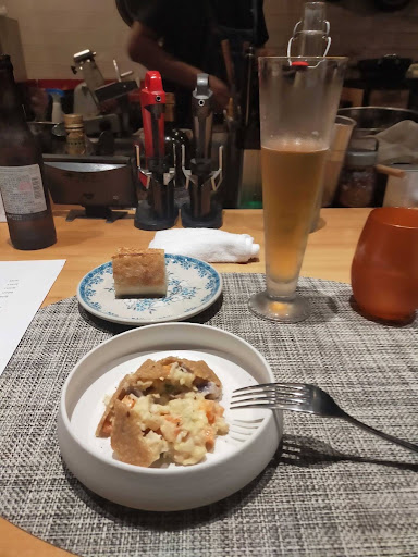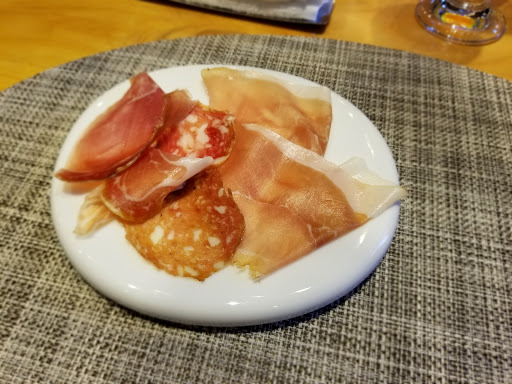 The selection of dried meats was from Italy and all were tasty. Then, fried eggplant topped with cheese and a creamy shrimp sauce. It was excellently seasoned and cooked. The pasta was a thick spaghetti noodle topped with dried cod roe from Italy, and topped with the chefs own home made roe. The thick noodles were cooked perfectly and the sauce was briny but not overly fishy like tarako can be.