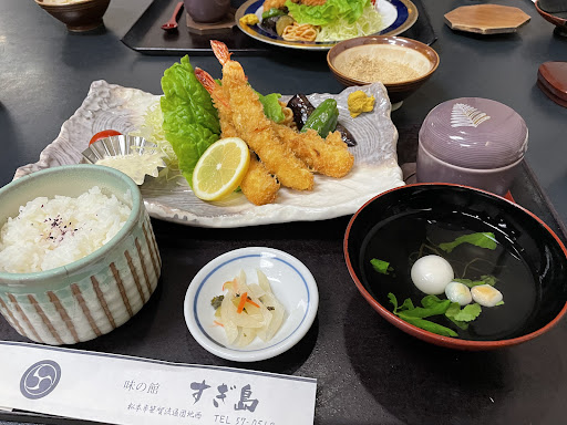 Read more以前から気になっていたすぎ島さん。 日曜の晩ご飯で寄らせていただきました。 客は私たち2人だけでした。 私はエビフライ定食、夫はヒレカツ定食。 先に届いたすり鉢に入ったゴマを擦りながら待つことしばし… ヒレカツもエビフライもカラッとしていました。 ゴマとソース(甘めで好き。自家製かな)を混ぜていただきました。 付け合わせのサラダ、ナポリタン、素揚げ野菜、茶碗蒸し、うずら卵が入った上品なお吸い物が付き、どれもとてもおいしかったです。 お店の方も親切で、またぜひ伺いたいと思いました...