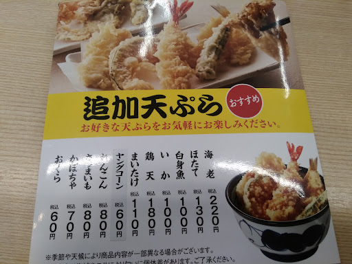 Read more天丼はもちろん、蕎麦も香り豊かで美味しいです。 減塩にも協力的でメニューにタレ少なめもOKとありますし、テーブルに天丼のタレもありますので、タレ無し天丼に自分でかける事も出来ますね。 手軽なお値段で美味しい天丼、でも蕎麦も美味しくて驚きました。 二八蕎麦とありますが、確かに良い蕎麦の香り、天丼との相性も良くセットメニューで有難いです。 天丼のメニューも豊富ですので、好みに応じて選べるのが良いですね。 店内も明るく清潔で、スタッフも笑顔で好感が持て、お年寄りや家族連れもゆったりしてました。 手軽で美味...