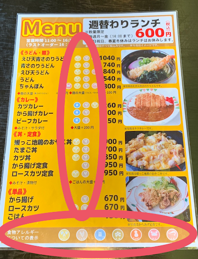 しっかり全てのメニューにアレルゲン表示されています。するとお子さんの該当するアレルゲンがひと目で分かります。逆にこれでお子さんの食べられるメニューが判断できます。しかも今ならコロナ禍で店内はガラガラで、安心して食事が出来ます。