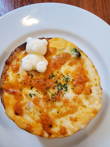 日曜日のランチタイムに訪問です。 店内はケーキ屋さんとカフェに別れていてカフェに案内していただきました。 店内はとても可愛らしく隅々まで女性が好むインテリアです。 食事をするテーブルも全体的に広くゆったりと使用することが出来ました。 注文したのはキッシュのグラタン。 ランチなのでサラダとスープが付いてきます。 サラダは手作り感溢れるニンジンのドレッシングがかかっていて身体に優しいサラダ。 スープもコンソメと玉ねぎの味がしっかりとしたスープです。 メインのキッシュのグラタンは、キッシュの生地の器の中にクリームグラタンが入っていました。 中にはマカロニやエビ、ブロッコリー、チーズ等々盛りだくさんです。 キッシュ生地を崩してグラタンと一緒に食べると本当にお腹がいっぱいになり満足しました。 写真を撮るのを忘れてしまいましたが、デザートに紅茶のシフォンケーキとアメリカンを注文。 どれもこれもとても美味しくて大満足でした。 又伺います。 ご馳走さまでした。