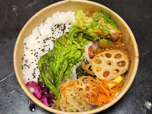 ご飯にはごま塩がかかってあります。 切り干し大根、レンコン揚げ、卵焼き、人参の炒めもの、青菜炒め?、肉団子、唐揚げ?、漬物とたくさんの種類が1プレートに入っていて少しずつたくさん食べたい私には嬉しいお弁当でした。 味付けは優しいお味で濃すぎず食べやすいです。 健康になった気分♪