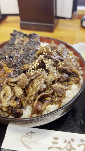 本日はそんな三谷さんで、鰻と松阪牛の両方を堪能できる欲張り丼「うな牛丼¥3,200」をオーダーです。三谷さんの鰻は、外はカリッと香ばしくカリッと香ばしく美味ですが、それより鰻のふんわりさが印象的です。口の中でトロける美味さ!卓上の山椒や追いタレをかけてもいいですが、ここの鰻には横に添えられたワサビがめちゃめちゃ合いますね。辛味が少なく風味豊かなワサビなので大量に欲しいものですw...
