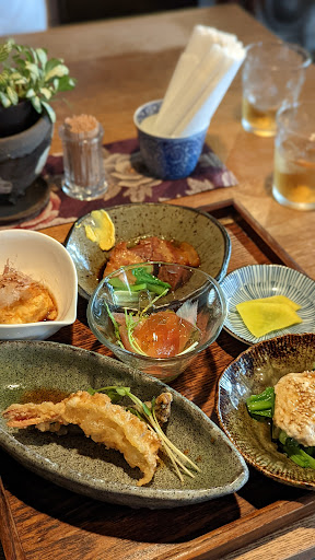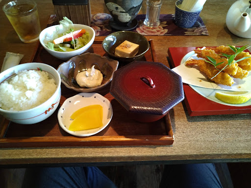 Read more予めネットで検索して予約して行きました。 松阪久保町の団地?の中にあります。ナビ設定をすると辿り着けますが、なかなか通りすがりに知るタイプのお店ではないです。お店の前には駐車場はなく、裏手に行くと7〜8台位停められる空き地があります。 外観、内装ともに古民家の良さを残しながら 改装されています。 ランチで伺いましたが、(ランチメニューは)そんなに種類は多くないです。 妹と2人、松花堂風お弁当をオーダー。小盛りのごはん、お味噌汁と沢山の種類のおかずがついてきます。器もオシャレで素敵です。煮物等のお惣菜のお味は少し濃い目でしたが、ビールが飲めるなら、おつまみに最高かしら。 男性には量がすこし少いかな?…ですね。 和風と洋風のランチもあります。 11時に予約して行きましたが、日曜だから?直ぐに席が埋まっていました。 オトナの隠れ家みたいな、すこし照明を落とした感じが古民...