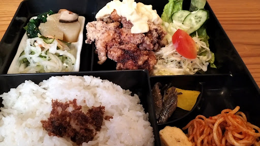 Read more本日の日替わり弁当「チキン南蛮弁当」 を、頂きました。 カレーか、オムライスか迷いましたが チキン南蛮弁当にしました。 和食も洋食も選べるのが良いですね。 箱の中に9種類もの、おかずが付いていてチキン南蛮は衣がサクサクで、ほんのり甘く、中はジューシーでお肉も柔らかくとても美味しかったです。 ご飯の量も多めで、大変満足できました。 チキン南蛮弁当が、こんなに美味しいのだからオススメとかの洋食系のメニューも美味しいに間違いないと、思います。 次回は洋食系を食べてみたいです。 お店は大変オシャレで綺麗でBGMも良くて、落ち着ける雰囲気でした。 店主のセンスが良いのがわかります。 色々な雑貨も置いてあり購入できるのかな?って思います。 初めての訪問でしたが、お店の人も感じが良くて最高でした。 店の人が感じ良い「心」料理の味「技」店の雰囲気、清潔さ「体」心技...