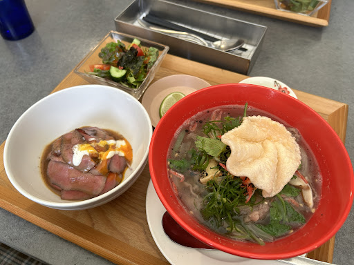 お友達とランチで伺いました。平日11:30のオープンに合わせて行きましたが、オープン5分前には既にお客さんがチラホラ。人気店のようなので、土日は予約必須かもしれません。 お店入ってすぐテラスになるのですが、このテラスがテンション上がります。開放感はないけど、外の空気と緑を見ながらは気持ちいいです。店内かテラスどちらでもいいとのことだったので、もちろんテラスへ。寒い日でしたが、屋外用のパラソルヒーターがあるので問題ないし、それが暖かい!ブランケットも置いてくれていますが、必要なかったです。まずはテラスから先に埋まっていく感じでした。 注文は、テーブルのQRコードからオンライン注文です。そのままオンライン決済もできるそうです(要確認)。レジではクレジットカードは使えず、PayPayか現金支払いなので、クレジットカード使いたい方はオンライン決済の方がいいかも。 ランチはフォーorパスタ+ミニローストビーフ丼にサラダ・デリ付のセットから選びます(¥2,090)。私は黒毛和牛のフォーを注文。 運ばれてきたセットは、フォーはしっかりサイズ、ローストビーフ丼もミニ?というくらいボリューミーな見た目。 サラダは、海苔も入っていてチョレギサラダのような味付けでした。デリは鶏肉で爽やかな味付け、箸休めっぽい感じかな。 フォーは、スープにお肉の出汁とパクチーが効いてて、しっかりエスニック。そしてライムを絞ると、酸味が加わってめちゃくちゃ美味しくて好みの味に!それだけで半分以上食べてしまいました。お酢は結構な量入れてみたけど、ライムの酸味に負けてるような?ライムを絞りすぎたのか、正直よく分かりませんでした。 ローストビーフ丼は、見た目通り、期待を裏切らない美味しさです。薄めに切ったお肉は柔らかく、食べやすかったです。 どっちもこのボリュームで食べられるのは嬉しいですね。ただ、やっぱりすんごい量です。男性の方は大満足の量だと思います。私はお腹も空かせて行って食べ切りましたが、新しいジーンズ...