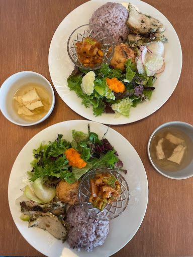 Read moreランチで利用。ランチメニューはベジとノンベジのプレートの2種類だったので、ベジプレートを選択。それと本日のスイーツ、アイスコーヒーを注文しました。 ベジプレートの食材は植物性のみ。こだわりの野菜たっぷりのお料理はどれも良い味付けで、とても美味しかったです! 本日のスイーツは、りんごと生クリームのビクトリアンケーキ。ふわふわシフォン生地に生クリームとたっぷり煮りんごがサンドされていて幸せな味でした💕 ノンベジプレートも気になるので、次回...