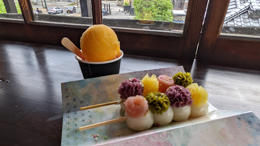 Great little shop serving high-quality, traditional sweets and gelato in a cute old Japanese remodeled house. This was by far the most delicious & most fancy dango 🍡 I've ever had - roasted mochi balls decorated with different colored anko bean paste This place is close to Dogo Onsen shopping street. It's one of the few plant-based vegan foods available in this area. Especially good with side of local citrus 🍋 sherbet 💕 Bonus if you eat in everything is plastic-free (unless you order a cold drink served in plastic cup with plastic lid & straw as is typical in Japan). If you get gelato or dango 🍡 it's served in paper cups & stylist card with...