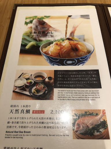 ย ย ย Read moreThe signature dish Uwjima-style sea bream set is pretty delicious as long as you are ok with raw egg and raw fish. Usually, the restaurant provides two different kinds of sea breams to choose from, one is naturally caught which is slightly more expensive, and the other is bred. On the day we dined, only the naturally caught type of sea bream can be chosen, and the sea bream itself is fresh and its texture is just like squid. The homemade sauce is amazingly delicious with the combination of condiments and rice. The partially grilled benito is, however, a slight disappointment, as the grilled flavor of benito skin didn't come out. The restaurant itself is clean and the chef is energetic and polite. Overall, it's a good choice in Dogo and Matsuyama area if you want to try authentic...