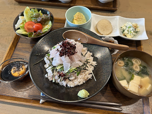 Read more友人と平日のランチに伺いました。11:30オープンとともに入店。和食料理のお店ですが、カフェのような小さいお店です。 愛媛はやっぱりお魚が美味しいので、数量限定のカンパチのお造り丼(¥1,380/カード支払)を注文しました。お友達は主菜が選べる「にのらんち」(¥1,280)で、3種類のおかずからメインを選択します。 オーダーは、テーブルの上にあるQRコードからネット注文すると50円引きとのことでしたが、会計は50円引きになってなかったな。ネット上での決済が必要だったのかしら? 運ばれてきたランチは、おかずの種類もいっぱいでボリューミー、そしてお造り丼の美しいこと!卵黄が入ったタレをかけていただきましたが、贅沢な卵かけご飯という感じです美味しくいただきました。あまりカンパチを食べることがない上に頭肉ということで、噛み締めましたが、歯応えもしっかり。淡白な味ですが、絡まった卵黄タレのおかげでスプーンが進みます。あと、添えてあるわさびが全然辛くないのに、わさびの香りがふわっと効いて、これも美味しかった〜。 全体的にかなりボリュームがあるので、男性も満足す...