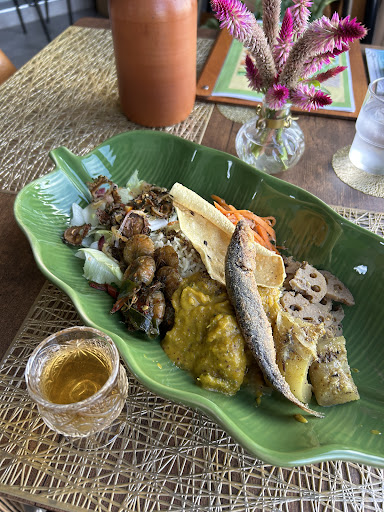 食事はお店自慢のカレーです。 スパイシーなのに、辛くないし、いろんな味や素材がミックスされているのに喧嘩しないし、本当に美味しかった。お野菜もたくさん入ってカラフルでした。エビを選びましたが、連れはエビの味付けがどうしてもダメだったそう。海外の味付けは好みが分かれてしまうようですね。パクチーとかダメな私ですが、全然平気でした。