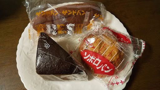 【「世界の中心で愛を叫ぶ」で有名⁈なのは「朔のコロッケパン」。でも、「豚たまドーナツ」がイチオシ】 ・ジャムソボロパン(130円)/トントロウィンナー(238円)/三食パン(173円)/豚たまドーナツ(194円) を頂きました。