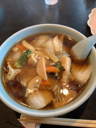 五目あんかけラーメンも塩辛くなくほんのり甘みのある上品なスープでした。 あんかけの具材も丁寧な仕込みで、肉は豚肉と鶏肉が切り方を変えて入っていてどちらも片栗粉がまぶされて柔らかく食べやすかったです。 白菜や筍に加えてかなり肉厚な干し椎茸をスライスしたものが入っていたのですがそれがとっても美味しかったです。