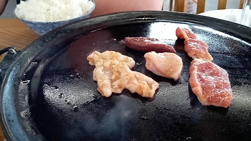 店舗の正面と真横に入り口がある。 この動線のひき方は繁盛店の予感。 入店するとビールこそやってないけど仕事の合間で 立ち寄った人達が小上がり卓にて鉄板で焼肉をワシワシと 焼いている。