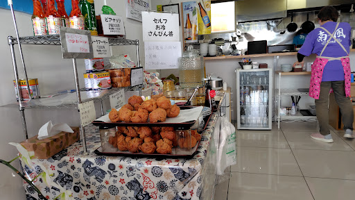 セルフサービスのさんぴん茶や、サーターアンダギーを購入した人もセルフで取れるスペースが用意されており、女性店員の方が丁寧に案内してくれました。アンダギーにふりかける黒砂糖粉末もあります。