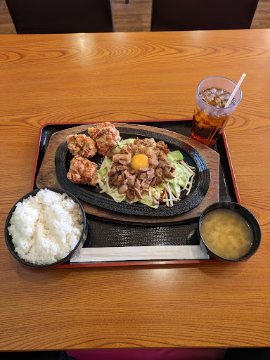 ランチは日替わりで800円 定食は1,000円前後でした。 スタカラ定食と本日のランチのやきそば定食を頼みましたが、やきそばの方は、、、普通!鉄板ナポリタンのように、玉子が敷いてありましたが、鉄板に玉子が、くっついてしまって食べにくく、やきそば自体の味も薄めでした。 スタカラ定食は、肉野菜炒めとからあげに生卵が乗ったもので、からあげの衣は卵入りのふんわりかりっとしっかりとした衣でした。肉野菜炒めも美味しくいただきました。 最後に小さな食後のドリンクも選べました。店員さんの感じも良く、ランチ時なので賑わってました。出てくるのはちょっと遅めかな。