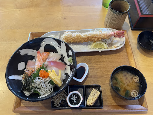 Read more宿泊施設も営むお食事処。 清潔感のある店内には、テーブル席とお座敷が。入口のホワイトボードに、その日の海鮮丼(10種)のネタが書かれている。(この日は、白身、まぐろ、イカ、サーモン、サヨリ、アジ、赤貝、海老、トビコ、しらす)