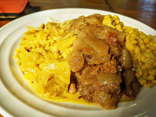 しばらく待ってると番号で呼ばれます。取りに行くとお盆にスプーンフォークセット、おしぼりと共に黄色の主張が激しいカレー皿がww ウコンライスも黄色、カレーも黄色。付け合わせのオニオンの酢漬だけが白いw