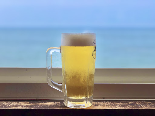 青い海に黄金のビール。 つまみは大あさり。サイコー! 翁大あさり焼はこちらの地方でよくある大あさりとは少し違った味付けで、きのこやパプリカらしきものも入り、味付けも少し変わっています。 ビールとの相性はバツグンです。
