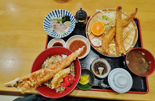 Read more平日ランチへ! 12時30分頃到着しましたが、空席あったため直ぐに着席できました。 あなごはん定食(1800円とちょっとの値段)を注文。 待つこと10分くらいかな? スマホ見ながら待っていたので、早く感じました。 まずは、ボリュームに圧倒されます。 穴子天丼(タレが美味!特大穴子天1本、カボチャの天ぷら1個)、特大穴子フライ2本、味噌汁(海の風味が塩っぱく感じる…エビの出汁?)、酢の物(柑橘系がキツい)、刺身(3切)、茶碗蒸し(しらす+ワカメ+底には銀杏ではなく、鶏肉と間違うようなブリ…かな?) 穴子天丼のご飯はやや少なめので、穴子フライを完食するのに少々手こずりました。 フライには八丁味噌を緩くしてゴマをまぶした特製味噌ダレが付いてきますが、これまた甘くて重たく感じるため、定食に付属のウスターソースや、刺し身醤油にワサビを入れてサッパリさせながら完食しました…