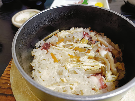 タコがふんだんに使われた釜めしはおこげの香りと合わさっていい香りが部屋中に広がります。 炊き加減もちょうどよく美味しかったです。