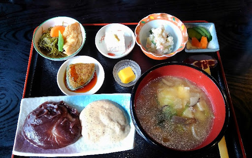 今回注文したのは、だんご汁セット(1200円)とわっぱ飯セット(1200円)です。注文してからは、およそ10-15分程度で提供されました。だんご汁セットの内訳は、東北の郷土料理であるしみもち(餅を凍らせて乾燥させた保存食)、三春揚げ(三角油揚)、自家製豆腐、小鉢(この日はポテトサラダ・刻み昆布などの煮物)、漬物、わらび餅、だんご汁です。わっぱ飯セットの内訳は、だんご汁セットとほぼ同じで、だんご汁がわっぱ飯・けんちん汁に変更になってものです。 だんご汁は根菜たっぷりで、優しい風味が汁の中でほっくりとしたジャガイモと小麦粉の素朴な味わいのだんごに染み込んで、美味しくいただくことができました。わっぱ飯は外連味のないスタンダードな味わいで、安心していただくことができました。三春揚げは、サクサクとした食感が楽しめました。自家製豆腐はしっかりとした存在感があって、載せてある味噌との相性がとても良い感じでした。しみもちは添えられているタレがとにかく甘しょっぱいのに全振り(つけすぎ注意)されていて、セットの中で異彩を放っていて、アクセントにちょうど良い感じでした。今回は通常メニューをいただきましたが、期間限定メニュー(夏季は三春素麺のついたそうめんセット)もあるようなので、次回来訪時には期間限定のものを頼んでみようかと思います。