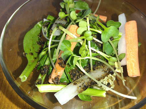 サラダ →結構酸っぱいドレッシング。美味しい。 パプリカや豆が入っていて健康的。 2人で分けるのに丁度いい。1人でも食べ切れる量。 トマトが甘い!