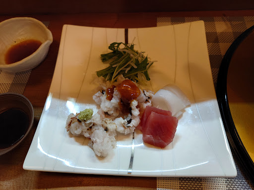 鱧のフルコースを食べました☺️値段は6千円☺️主人は京都で修業して鱧も何回も捌いており骨切りは完璧で美味しく頂きました☺️ 最初は鱧の湯引きとマグロとイカの付いたお刺身セットです☺️鱧は梅肉とわさびで食べましたがどちらもかなり美味しいかったです😆 2つ目は鱧の卵とかいろんな鱧の部位の入ったジュレです😆これはかなり絶品でした😆他ではなかなか食べれない1品だと思いました😆3つ目は鱧のおわんもので鱧とナス入っていてこれも美味しいかったです😆 4つ目は鱧のソテーでソースが鱧が合って良かった😆 5つ目は はもとオクラ、柑橘系が入ったものでソースが美味しいかった😆出汁がかなり美味で全部飲みました😆 6つ目は焼いた鱧を出汁でやってる1品😀これも美味しいかったです😆 7つ目は鱧の天ぷら香ばしくて良かったです😆 8つは鱧の雑炊😆これは鱧の出しとってやってるのでかなり美味😆最後はデザートこれも良かった😆 6千円でこの味と数ならかなり安いので皆さん是非食べてみては?😆料理の内容が少し間違ってるかも知れません😓うる覚えなので😓間違ってたらすいません😓ほぼほぼ合ってるとは思います☺️ これに日本酒は格別...
