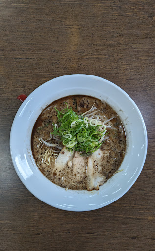 以下は前回訪問時のレビューです 火曜日の12:40頃の到着です。 駐車場は8割方埋まってましたが広いので 余裕で駐められました。店内は満席で店内待ち二組目でしたが5分ほどで奥のテーブル席に座るようにと案内されました。席につくと麦茶が運ばれてしばらくしてからオーダーを聞きに来てくれます。 写真は「熊本風黒とんこつラーメン(並)」803円税込 ラーメンの種類は何でもあり、相当迷いましたが他所ではあまり見かけないのでオーダー。ちなみにバリカタ。7,8分での到着です。黒いマー油が浮いており確かに黒いラーメンです。 先ずはスープをひと口。マー油の油感がしっかり効いたまろやかでクリーミーな熱々とんこつスープです。うまい。 麺は大好きな細いストレート麺。リフトしただけでワクワク感が止まりません。喰らいつくとパツンパツンの歯切れの良い美味しい麺♪バリカタでお願いして正解です。ハリガネでもよかったかもです。 トッピングはチャーシューが3枚、モヤシ、おネギです。チャーシューは小振りで薄めですが固めの歯ごたえで気に入りました。おネギとモヤシはシャキシャキ。 しっかり美味しいとんこつラーメンであっという間の完食です。次回はどの味にしまし...