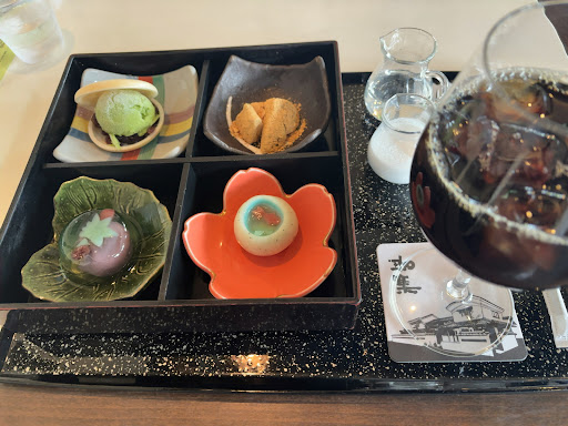 Read more何時でも駐車している車が多いのですが、今日は混んでいなかったので、入りました。ミニパフェと紅茶を頼みました。庭には紫陽花が咲いて水の流れがあり、散歩の帰りの暑さも少し和らぐ気がしました。和菓子とお茶のセットも有ります。和菓子は本社で作っていて、毎月変わるということです。店員さんも気持ちの良い応対でした。