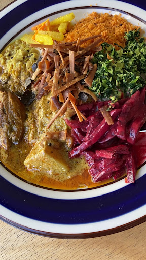上に乗った副菜も、フシメンのフライは歯ごたえが良いアクセントになっているが、人参や青菜はそれのみ食べても混ぜて食べても、よく合っているとは思えない。 ビーツ(?)は酸味があるかと思いきやしまりのない味付けで、ジャガイモはかろうじて煮えている程度で味が染みていない。 スパイスカレーが苦手なわけではなく、他店のもので満足した経験もあるので、こちらのが合わなかったのでしょう。