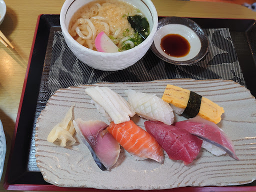 Read more昔から地元の人に親しまれている寿司屋兼うどん屋兼定食屋と言った感じの店です。 お造り定食1080円を頂きました。 はっきり言わせて貰おう…えっ、これで1080円⁈めっちゃお得やん‼︎(某世界的通販会社CM風)😳 ここ、大原は中国山地にほど近い山あいである。 そこで刺身?とお思いになる方もござろうが、イヤイヤイヤイヤ侮るなかれ。 大満足なお造り定食でした。 小さなお店なので、他のお客様の手前、写真は撮れませんでした。 非常に年季の入った店ですが、とても清潔にされてます。 テーブル備え付けの塩や醤油の蓋が一切汚れてなかった(小姑の様にチェック)😎 やあ、美味しかった。 田中酒造所で酒を買うため、立ち寄った大原でし...