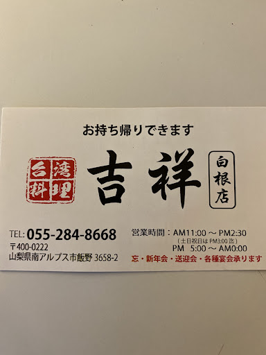 Read more食事は味、ボリュームともに満足です。コスパがとても良いと思いました。 店内は古さが感じますが居心地は悪く無いです。ファミレスの様なボックス席と小上がりの席が有ります。 2024/7に行きましたがもう少し冷房が効いていたら良いと思いました。 キムチチャーハンと唐揚げのセットを頂きましたが唐揚げが食べきれなかったのでお持ち帰りにして貰いました。 タッパーは店員さんにお願いすれば用意して貰えます。 唐揚げがカリカリで美味しかったです。キムチチャーハンも程よい辛さで美味しかったです。 支払いは現金のみでした。 駐車場はホテルと共同ですが、ホテルと吉祥...