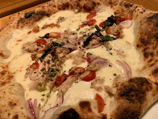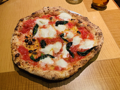 An excellent brick wood-fired oven for Napoli-style pizza. Great flavor to the rustic crust, but lacking the slight tang from proofing with olive oil. Well done consistency, a libretto. Folded with little issue.