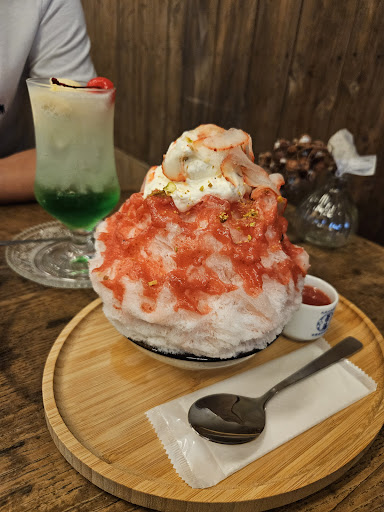 いちごのかき氷¥1100とメロンクリームソーダ¥550を注文! かき氷はいちご、桃、ブルーベリーなど数種類🍓ふわふわでとろける系🍧別添のシロップがおちょこ🍶に入ってて酒造ならではで素敵でした🫶