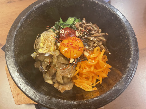 Pictured is the ishiyaki bibimbap (in a stone pot, not a bowl - they have regular bibimbap too), which comes with seaweed soup and kimchi. There’s also an option to get this in a larger set with coffee/tea etc. It doesn’t explicitly say it’s vegetarian anywhere, but I asked if they could do bibimbap with no meat and they said yes! Everything was so delicious, quick and very reasonable (~$2600...