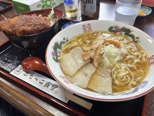 ふたっこ食堂のこだわり醤油ラーメン、会津ソースカツ丼、美味しかったです。令和7年10月3日(金)に福島県南会津町荒海地区の新しくオープンしたお店です。オープン直後はすごい行列で、閉店時刻前に売り切れになってしまうほど大盛況でした。今回も名前を記入して約30分待って店内に案内されました。こだわり醤油ラーメンのスープは豚骨ベースで、かすかにシイタケらしき旨味を感じます。余韻として昆布の旨味が口の中に広がります。鶏ガラは感じません。スープをはじめはやや薄味に感じますが、食べ進めるうちに素材の良さが幾重にも感じられるレベルの高いスープに感激です。麺は地元の製麺所奈良屋製のやや細めちぢれ弱めの中太麺でで、奈良屋さん特有のツルツル感マックスでの提供となります。チャーシューは脂身が口の中でとろけ、赤身は噛むごとに肉の旨味が口の中に広がります。会津ソースカツ丼は蓋が閉まらない状態での提供で、カツの大きさも期待以上です。カツの食感はソースをまとった状態で、サクサクと言うよりはザクザク食感で、やや甘めのソースが食欲をかきたてます。カツは脂身と赤身のバランスもよく、脂身は甘みさえ感じます。南会津町に彗星のように現れたふっ...