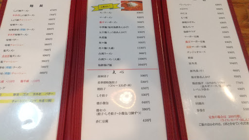 Read more様々な県の町中で見かける台湾料理のチェーン店かと思っていたけど、台湾料理の表記が無いから多分違う気がする。 ランチセットがお得で、言えば大盛にしてもらえるし、マーボー豆腐を辛口にしてもらえる。料金はかかる。 お米が固めに炊いてあって個人的には好み。マーボー飯とよく合う。 チャーハン大でも相当な量(3人前くらい)なのに、それを大盛にもできる。5人前くらいあるのでシェアして食べるといい。固めのお米で作ったチャーハンなのでパラパラしてる。しっとりチャーハンが好きな人には苦手かも。自分は好み。 唐揚げは、揚げ具合(かりかり/ソフト)と味(長ネギソース/塩こしょう)を選べる。頼んでないけど長ネギソースは油淋鶏みたいな感じだと説明された。頼んだ唐揚げは、かりかりで塩こしょうで美味しかった。 ラーメンがかなり美味しい。町中のチェーン台湾料理店は特にラーメンの麺とスープが酷いけど、ここはそんなことがない。しょう油、味噌、塩、香味、激辛マーボーメンを食べたけど、どれも美味しかった。煮干し出汁は使ってないから、喜多方ラーメンよりは白河ラーメンに近いかも。食べてないけどスーラーメンが一番出ていて、みんな注文していた。 マーボー飯やマーボーメンの肉は挽肉ではなく角煮かチャーシューを使っている。この肉にも味付けしてあってご飯が進む。