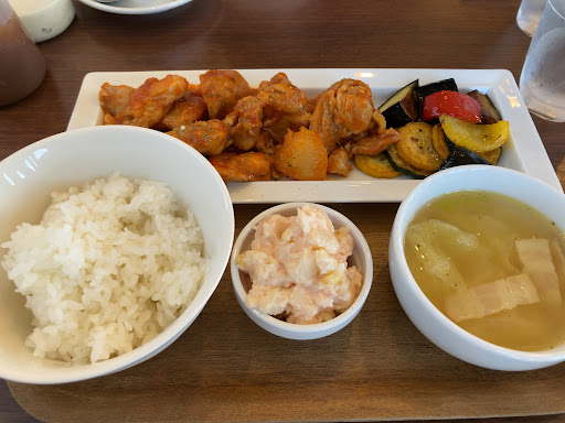 日替わりでチキンのトマト煮食べましたが、柔らかく煮込まれてて美味しかったです。 付け合わせの夏野菜も甘くて美味でした♪ さらに、明太ポテトサラダにスープまでついてるのと、ご飯はおかわり無料なので、かなり量は満足できます。