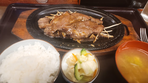 たっぷりのモヤシの上に良い照り具合いのステーキが。 焦げた醤油ダレが肉にもモヤシにも良く絡んでいて、美味い ❢ 大学時代に、こういう味の焼肉定食が好きで良く食べてなー、の思い出にドップリでした。