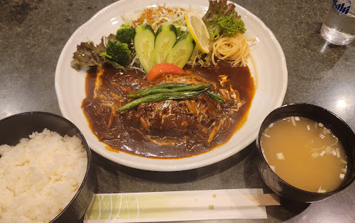 2022.3.5.▶️ 大雄山駅に永く人気の洋食屋ありとの噂をかつて聞き、春一番が吹き荒ぶ今日、初訪店が叶った。 13:00を少し回った頃、駅から建物をくぐる通路に面したドアを引くと'70-'80年代風の素敵にこなれた雰囲気の店内は予想外に広い印象。カウンターの中にご主人、フロアは専ら奥様と思しき女性がご担当の様子。他には常連さんらしき2組の客。わたしと連れは共に手造りハンバーグセットを所望。暫し待って料理は運ばれてきた。 …旨い。しっかりと吟味し尽くされたこのミートパティは旨さを醸す源、そこにきっとご主人の大いなる研究成果であるオリジナル・ドゥミグラスソースがたっぷりとあしらわれた噂どおり、否それらを軽々と超えた珠玉の逸品である。 遠い昔、わたしが初めて都内の某るきちんとした店で自分の財布で食べたstewed hamburgは、確かこういう贅沢で豊かで親しみ深い味だったのではなかったか。もう35年以上も前のことで定かではないが、世にはこんなにも旨いハンバーグがあるのか、こんなに旨いものを作る人がいるのかとびっくりしたことをよく憶えている。ハンバーグとは昔も今もわたしにそういう新鮮な驚きを齎してくれる食べ物である。 当屋はこの素晴らしきひと皿にご飯と味噌汁が付いて全てをお箸でいただくスタイル。わたしたちの国の正当的な洋食流儀である。暮らしの程近くに当屋のような素敵なお店を知ることができて嬉しい。 近々またこのハンバーグを楽しみに来ようか。いや次の機会はオムライスをいただこうか。待てよ、鶏好きのわたしは今チキングリルにもぐっと心を惹かれている。 …ご馳走さまでした。また伺います。